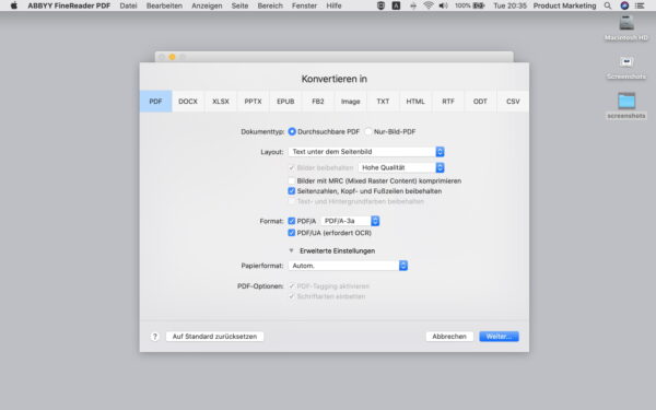 Die vielfältigen technischen Vorteile und Funktionalitäten komplettieren das umfangreiche Angebot der Software Abbyy Finereader PDF for Mac äußerst erfolgreich. Eine Möglichkeit zur Optimierung Ihrer Dateien bietet Ihnen beispielsweise die zuverlässige MRC-Komprimierung, mit der Sie die Größe Ihrer Dateien reduzieren können. Dennoch genießen Sie weiterhin eine ausgezeichnete Qualität und können zeitgleich eine beträchtliche Menge Speicherplatz auf Ihrem Computer einsparen.