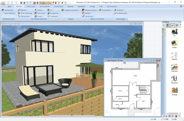 Mit dem integrierten Objekt-Katalog haben Sie uneingeschränkten Zugriff auf eine enorm große Auswahl an Bauelementen, Texturen, Materialien und Symbolen. Sie können ganz einfach per Mausklick Türen, Fenster, Balkone, Carports und sogar Sanitär- und Elektroinstallationen platzieren. Außerdem können Sie problemlos viele weitere Objekte aus SketchUp und Collada importieren. Dadurch erhalten Sie bereits während des Planungsprozesses eine genaue Vorstellung vom endgültigen Produkt, einschließlich aller feinen Details!