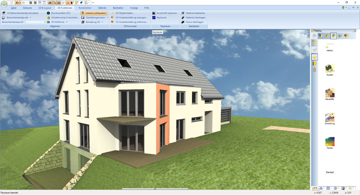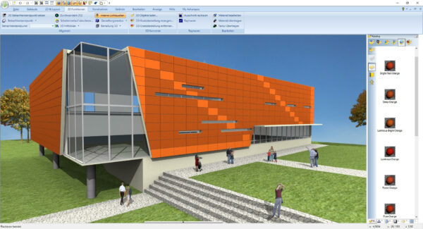 Indem Sie den integrierten Katalog von Objekten verwenden, haben Sie die Möglichkeit, aus einer großen Auswahl an Bauelementen, Texturen, Materialien und Symbolen zu wählen. Sie können Türen, Fenster, Balkone, Carports sowie Sanitär- und Elektroinstallationen mühelos mit nur einem Klick platzieren. Zusätzlich haben Sie die Option, eine Vielzahl weiterer Objekte aus SketchUp und Collada ohne Probleme zu importieren. Aufgrund dieser Funktion können Sie bereits während der Planungsphase ein detailliertes Bild des Endprodukts inklusive aller Details erhalten!