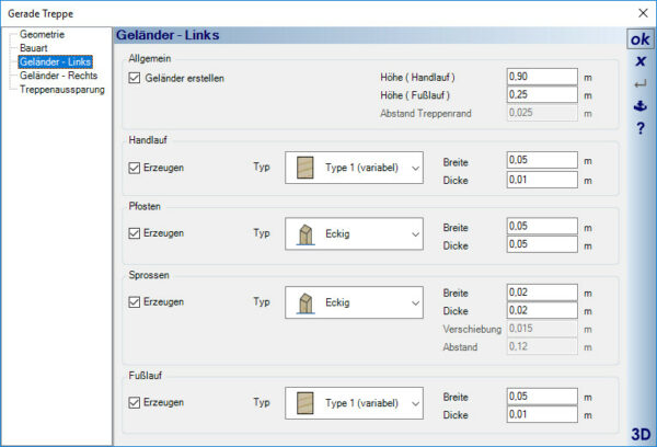 • Treppenbestandteile können einzeln aktiviert oder deaktiviert werden.