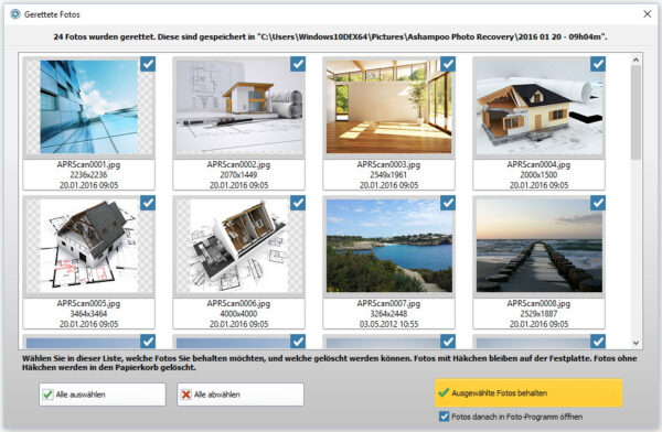 dazu anzusehen.wenn sie irrtümlicherweise bilder von ihrer festplatte gelöscht haben, ist es ratsam, unverzüglich die anwendung des ashampoo photo recovery programms zu starten. anschließend können sie den vorgang des scannens in gang setzen. die software wird in der lage sein, ihren computer und dessen festplatten nach möglicherweise wiederherstellbaren bildern abzusuchen. sie erhalten selbstverständlich eine vollständige übersicht über alle verfügbaren bilder oder dateien, die im rahmen der wiederherstellung gerettet werden können. nach einer kurzen überprüfung haben sie die möglichkeit, die gewünschten bilder auszuwählen, sie mit einem einzigen klick zu aktivieren und das ashampoo photo recovery programm den rest erledigen zu lassen. nach nur wenigen sekunden können die fertigen und geretteten dateien wieder auf der festplatte gesichert werden. es ist jedoch ebenfalls von wichtigkeit festzustellen, ob und in welchem ausmaß erfolgsaussichten bestehen. dadurch wissen sie bereits im vorfeld, ob sie die bilder auch tatsächlich wie gewohnt verwenden können.