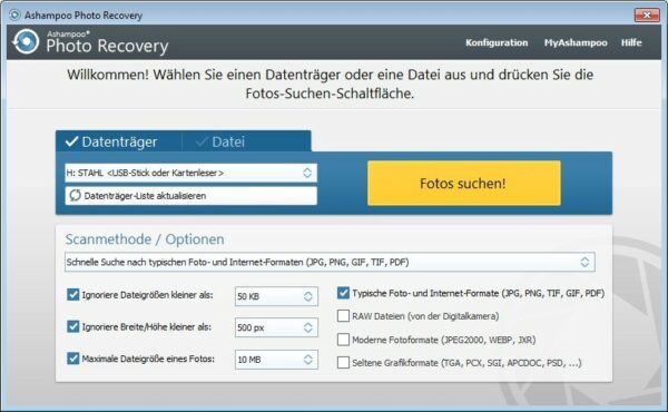 überdies erweist sich ashampoo photo recovery nicht bloß als äußerst wirkungsvoll, wenn es darum geht, versehentlich eliminierte dateien oder abbildungen wieder in den ursprünglichen zustand zurückzuversetzen, sondern auch in einer vielzahl anderer szenarien. diese tatsache ist bezeichnend beispielsweise für den fall einer speichertechnik-fehlfunktion, wie einer defekten kamera- oder smartphone-speicherkarte. sogar ein formatierter usb-stick kann ohne schwierigkeiten unterstützt werden, genauso wie ein fehlerhaftes dateisystem. es steht außer frage: ashampoo photo recovery kann nicht lediglich für interne festplatten und laufwerke ihres computers verwendet werden, sondern ebenfalls für externe speichermedien. ganz gleich, ob speicherkarten, externe festplatten oder usb-sticks – mit minimalem aufwand haben sie die möglichkeit, problemlos dateien und abbildungen von vielseitigen speichertechnologien wiederherzustellen.