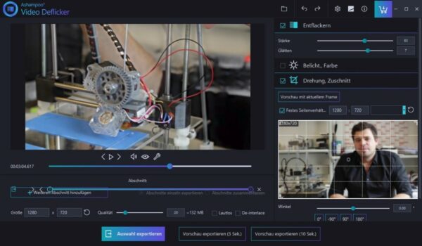 Jedoch bietet das Programm Ashampoo Video Deflicker auf Wunsch eine Vielzahl weiterer Features und Funktionen, die es Ihnen ermöglichen, effizient mit Videodateien zu arbeiten. Denn oft führt nicht nur das Flimmern zu einem deutlichen Qualitätsverlust. Viele Benutzer möchten auch zusätzliche Anpassungen vornehmen, um das Video an ihre eigenen Bedürfnisse anzupassen. Zum Beispiel den Weißabgleich, die Belichtung oder die Sättigung. Mithilfe von Schiebereglern können Sie diese einzelnen Parameter ganz einfach ändern, um Ihren individuellen Geschmack zu treffen. Wenn Sie Ihr Video drehen oder spiegeln möchten, können Sie dies auch problemlos mit der Software Ashampoo Video Deflicker tun. Für das Drehen oder Kippen Ihrer Dateien und Videos bietet die Lösung verschiedene voreingestellte Optionen von 90, 180 oder 270 Grad. Sie können diese mit nur einem Klick auswählen. Alternativ können Sie den gewünschten Drehwinkel auch manuell eingeben, um individuelle Ergebnisse bei der Verwendung des Programms Ashampoo Video Deflicker zu erzielen. Es ist auch wichtig, den Inhalt zu spiegeln. Dafür stehen entsprechende Tools zur Verfügung. Ob horizontal oder vertikal, Ihnen steht die volle Freiheit bei der Auswahl zur Verfügung. Entscheiden Sie sich für die gewünschte Option und sehen Sie nach einigen Sekunden, wie das Video nach der erfolgreichen Bearbeitung aussieht. Schließlich haben Sie auch die Möglichkeit, die Videos zu schneiden. Verwenden Sie diese Funktion, wenn zum Beispiel nicht alle Inhalte des Bildes angezeigt werden sollen. Schneiden Sie alle nicht benötigten Elemente heraus oder nutzen Sie eines der zahlreichen vordefinierten Formate, um die Arbeit mit Ihren Videos und Dateien erfolgreich abzuschließen.