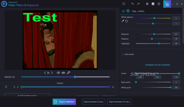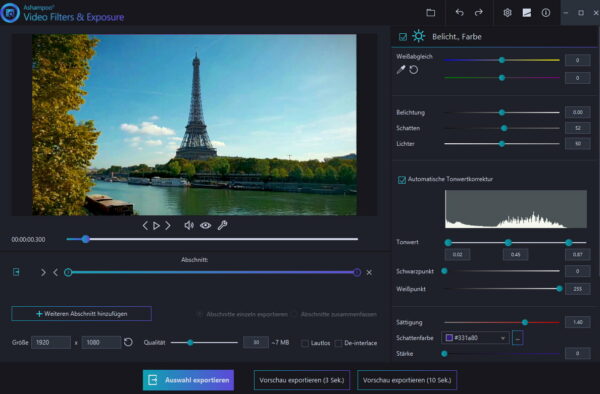 es gibt zusätzliche funktionen und features in der ashampoo software video filters and exposure, die eine effektive bearbeitung der videos ermöglichen und die qualität deutlich verbessern. sie haben beispielsweise die option, wichtige parameter wie belichtung, sättigung und weißabgleich nach ihren wünschen anzupassen. mit nur wenigen handgriffen können sie die werte ändern und somit die qualität ihrer videos erheblich steigern. diese anpassungen können mühelos und individuell mithilfe eines einfachen schiebereglers vorgenommen werden.