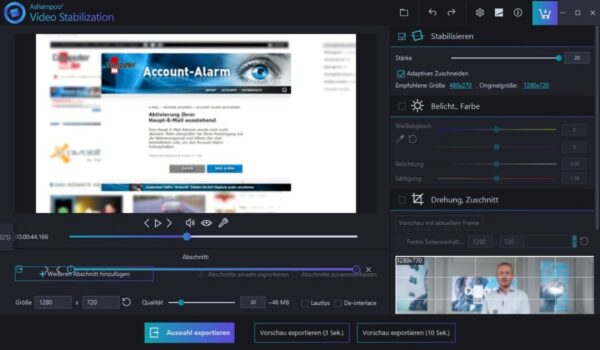 Mittels der Software Ashampoo Video Stabilization haben Sie die Gelegenheit, verschiedene Parameter der Datei anzupassen oder zu ändern, um die Qualität Ihrer Videos signifikant zu verbessern. Zu diesen Einstellungen gehören beispielsweise der Weißabgleich, die Belichtung und die Sättigung. Durch einige wenige Aktionen können Sie die idealen Anpassungen vornehmen. Falls Sie bestimmte Bereiche in Ihren Videos hervorheben möchten, steht Ihnen eine Schnittfunktion zur Verfügung. Diese ermöglicht es Ihnen, unerwünschte Inhalte schnell und einfach zu entfernen. Sie haben die Möglichkeit, den Zuschnitt nach Ihren individuellen Vorstellungen und Bedürfnissen vorzunehmen. Als Alternative können Sie Ashampoo Video Stabilization die Arbeit überlassen, indem Sie eines der bereitgestellten Formate auswählen und anwenden.