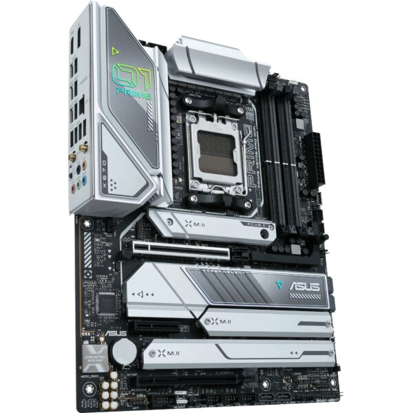 Das ASUS PRIME X670E-PRO WIFI bietet all das in einem schlanken, futuristisch anmutenden Gehäuse, das mit seinem silberfarbenen Namensschild und der Chipsatzabdeckung an ein Raumschiffdesign