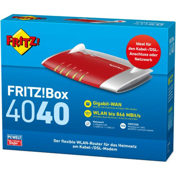 Mit der FRITZ!Box 4040 erweitert AVM die Reihe der FRITZ!Box-Router ohne integriertes Modem um ein neues Spitzenmodell. Die FRITZ!Box 4040 lässt sich als schneller WLAN AC-Router an jedem vorhandenen Netzwerk oder einem beliebigen DSL-, Kabel- oder Glasfaser-Modem einsetzen. Auch UMTS-, HSPA- und LTE-Sticks für den Internetzugang werden unterstützt. Mit gewohntem Komfort verbindet die FRITZ!Box 4040 sämtliche Computer, Smartphones, Tablets und weitere netzwerkfähige Geräte untereinander und mit dem Heimnetz.