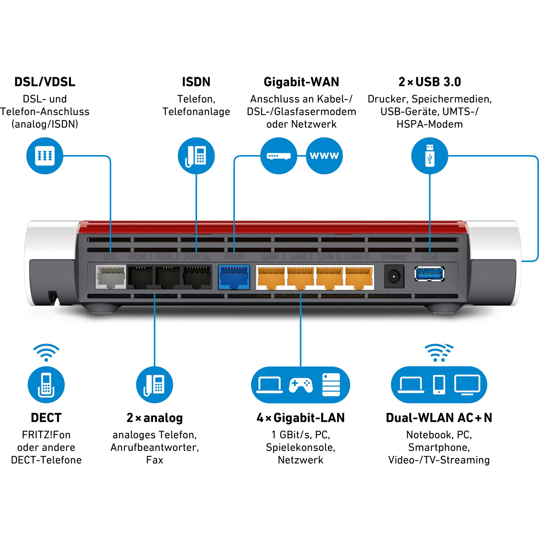 Die FRITZ!Box 7590 bringt das High-Speed-Heimnetz an jeden DSL-Anschluss egal ob ADSL, ADSL2+ oder VDSL und wird mit einer Fülle an Extras höchsten Ansprüchen gerecht. Die FRITZ!Box unterstützt mit VDSL-Supervectoring schon jetzt den künftigen Standard für Übertragungsleistungen von bis zu 300 MBit/s. Damit verdreifacht sich die Geschwindigkeit am DSL-Anschluss und Downloads riesiger Datenpakete erfolgen in Rekordgeschwindigkeit. Die FRITZ!Box 7590 kann sowohl an IP- wie auch an herkömmlichen DSL-Anschlüssen (mit analoger oder ISDN-Telefonie) sämtlicher Anbieter eingesetzt werden.