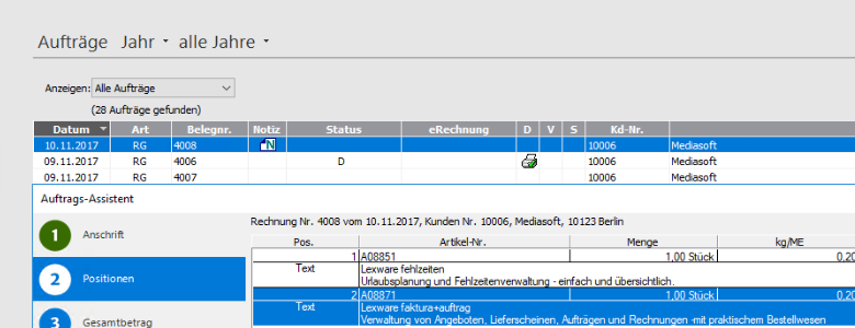 Mithilfe von Lexware Faktura+Auftrag 2026 365 kann der Geschäftsinhaber seine Auftragsverwaltung effizienter und wirtschaftlicher gestalten, was sich positiv auf den Unternehmenserfolg auswirkt. Zusätzlich bietet die Software verschiedene Analysemöglichkeiten, die solide Informationen für zukünftige geschäftliche Entscheidungen liefern. Selbst unerfahrene Anwender haben dank der benutzerfreundlichen Benutzeroberfläche keinerlei Probleme bei der Anwendung der Software.