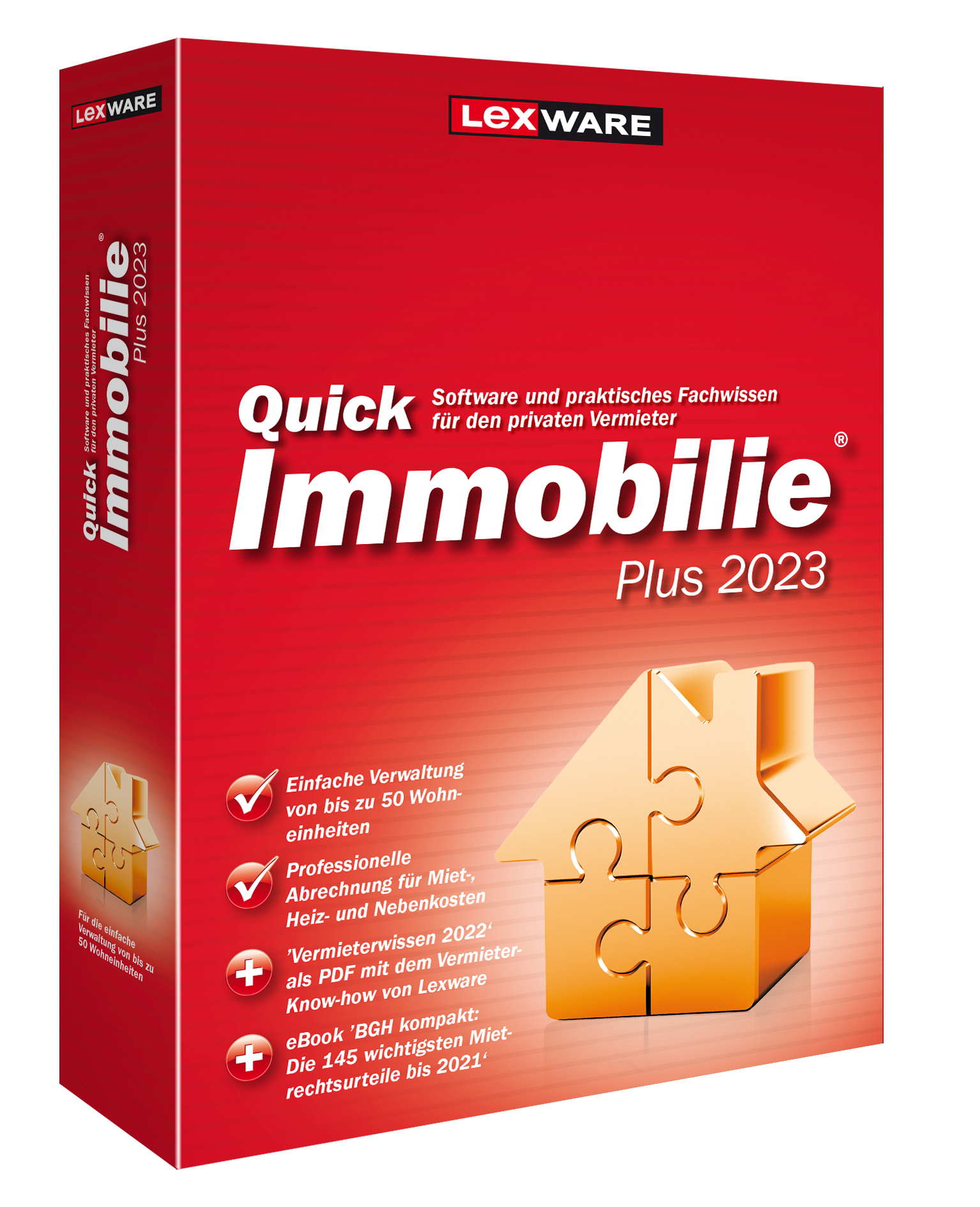Die Software QuickImmobilie Plus 2026 von Lexware stellt Vermietenden ein umfassendes Wissenspaket zur Verfügung, um ihre Vermietungsaktivitäten optimal zu unterstützen. Zusätzlich erleichtert die Software die Buchhaltung und ermöglicht eine unkomplizierte Erstellung von Abrechnungen für Miet-, Heiz- und Nebenkosten am Windows-PC. Des Weiteren können sowohl Einnahmen-Überschuss-Rechnungen für gewerbliche als auch für private Mieteinheiten problemlos erstellt werden. Die Plus Edition der QuickImmobilie bietet außerdem praktische Funktionen, um Eigentumsgemeinschaften effizient zu verwalten. Besondere Merkmale der Plus Edition der QuickImmobilie beinhalten:
