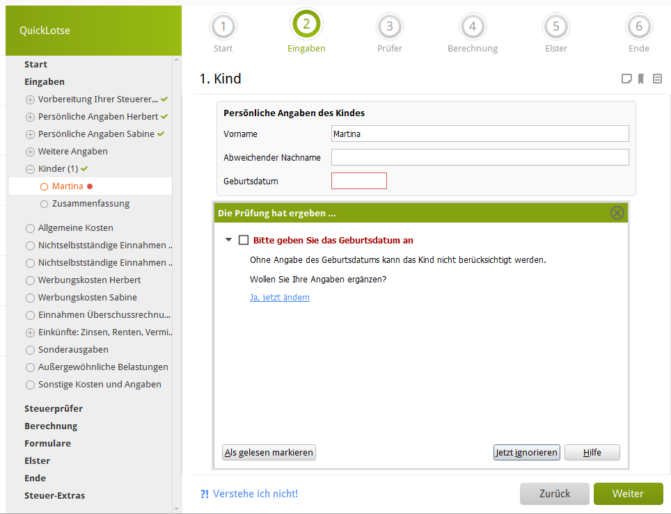 um die negativen folgen von unerwünschten fehlern effektiv zu vermeiden, durchläuft lexware quicksteuer deluxe 2026 kontinuierlich eine überprüfung der eingaben in den eigenen feldern und formularen. dadurch werden unkorrekte angaben oder fakten sofort erkannt. sollte während der arbeit oder beim erstellen der steuererklärung ein derartiger fehler auftreten, erhalten sie selbstverständlich sofort eine benachrichtigung von der software, begleitet von entsprechenden anweisungen zur fehlerbehebung oder umgehung.