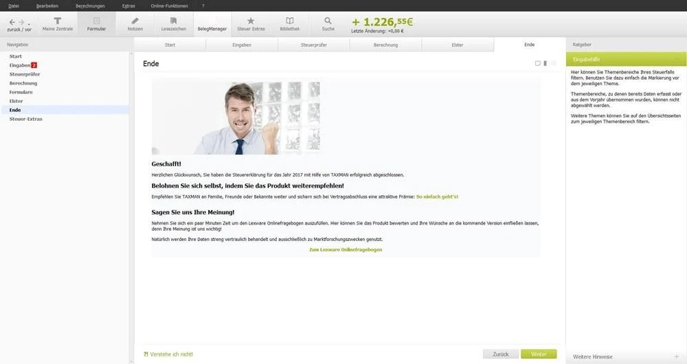 taxman 2026 ist eine äußerst gute softwarelösung für arbeitnehmer, kapitalanleger, familien, eigenheimbesitzer, studenten und arbeitsuchende im steuerjahr 2026. die interviews werden in form von videos präsentiert und bieten einen praktischen schnelleinstieg für die erstellung der einkommensteuererklärung 2026. im vergleich zu den vorherigen versionen gibt es nun neue druckoptionen zur auswahl. neben dem beidseitigen drucken können sie jetzt auch pdf-dateien generieren und mehrere dokumente auswählen, darunter elster-dokumente und ausfüllbare vordrucke, um diese gleichzeitig zu drucken. der benutzerfreundliche elster-assistent unterstützt sie dabei, die erforderlichen daten in nur wenigen schritten an das zuständige finanzamt zu übermitteln und hält sie über den aktuellen bearbeitungsstand auf dem laufenden. sie können problemlos überprüfen, ob ihre steuererklärung für das steuerjahr 2026 vollständig und erfolgreich bei der finanzbehörde eingegangen ist.