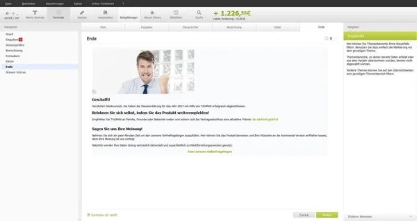 taxman 2026 für die veranlagungsperiode 2026 ist eine hervorragende wahl für arbeitnehmer, investoren, familien, hausbesitzer, studenten und jobsuchende. die interviews mit unterstützung von videos und die praktische funktion für einen schnellen einstieg erleichtern die erstellung der einkommensteuererklärung für das vergangene jahr 2026 in erheblichem maße. im vergleich zur vorherigen version bietet die software nunmehr zusätzliche optionen für den druck an. dadurch haben sie nicht nur die möglichkeit, dokumente beidseitig auszudrucken, sondern auch pdfs zu erstellen und mehrere dokumenttypen, wie z.b. elster-dokumente und ausfüllbare vordrucke, bequem auszuwählen und gleichzeitig zu drucken. dank des benutzerfreundlichen elster-assistenten können die daten in nur wenigen schritten an das zuständige finanzamt übermittelt werden, während sie über den aktuellen stand der bearbeitung informiert werden. so können sie problemlos erkennen, wann ihre steuererklärung für das jahr 2026 vollständig und erfolgreich beim finanzamt eingegangen ist.