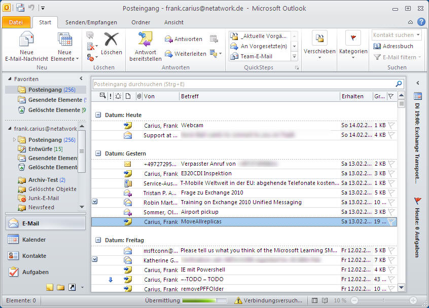 Outlook 2010 verfügt über eine modernisierte Benutzeroberfläche, verbesserte Tools zur Organisation Ihrer E-Mails, eine leistungsstarke Suchfunktion sowie Kommunikations- und soziale Netzwerkfunktionen. Dadurch können Sie in Ihren persönlichen und geschäftlichen Netzwerken produktiv und effektiv agieren. Bleiben wir in Verbindung und profitieren Sie von all den Möglichkeiten, die Outlook 2010 bietet.