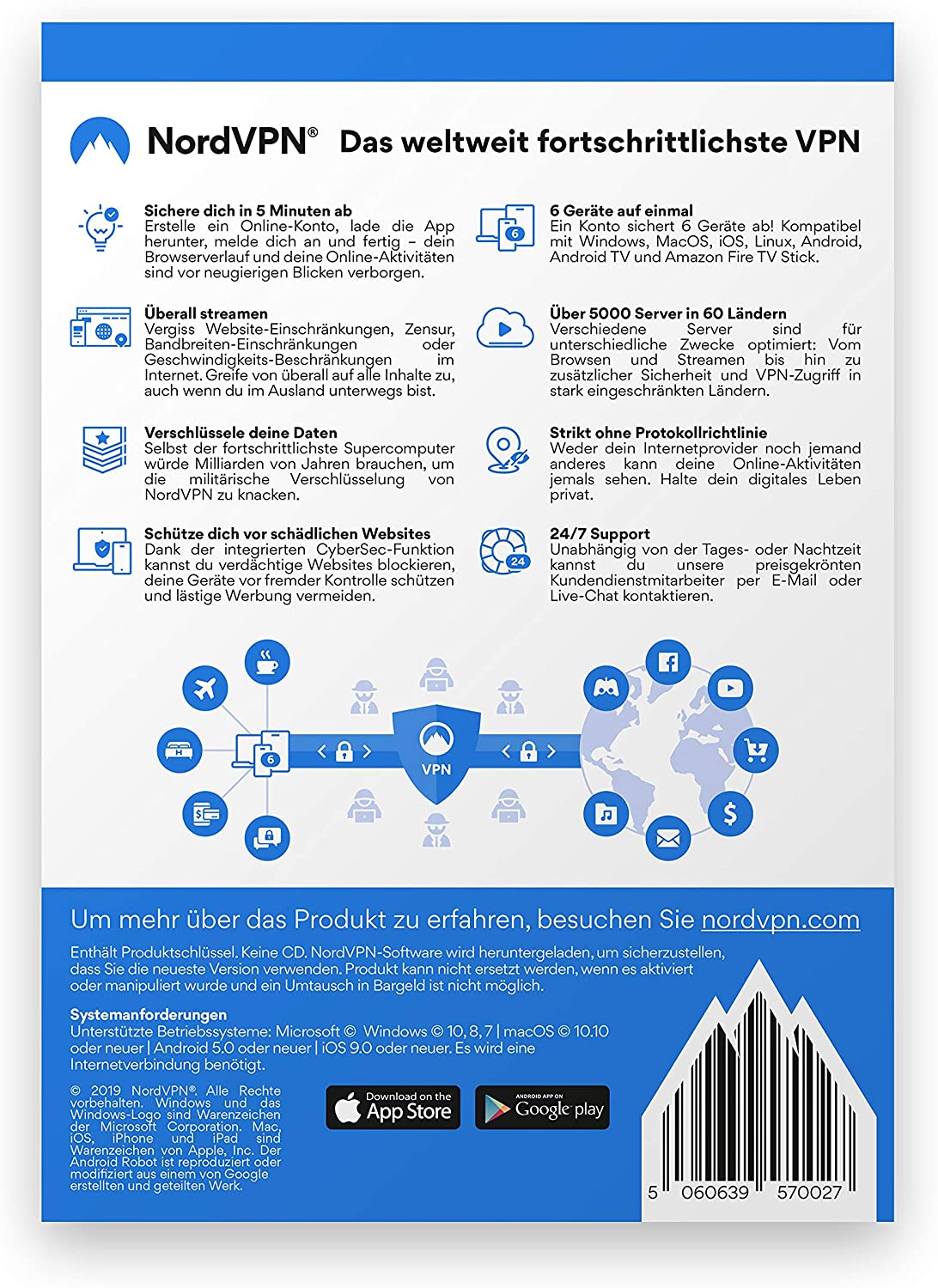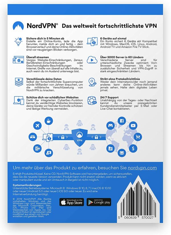 Mit einem virtuellen privaten Netzwerk, auch bekannt als VPN (Virtual Private Network), können Sie sicher und anonym im Internet surfen und Ihre Online-Identität schützen. Einer der weltweit führenden Anbieter von VPN-Dienstleistungen ist NordVPN. NordVPN bietet eine breite Palette an VPN-Client-Software für verschiedene Betriebssysteme wie Windows, macOS, iOS, Android und Linux an. Wenn Sie NordVPN über unseren Shop erwerben, erhalten Sie eine äußerst effiziente VPN-Software, die Zugriff auf ein beeindruckendes Netzwerk von mehr als 5.500 VPN-Servern in über 60 Ländern ermöglicht. Diese Software kann auf bis zu sechs Geräten mit nur einem Account verwendet werden. NordVPN schützt Ihre Daten wie Standortinformationen, Gerätetyp, IP-Adresse und Browserverlauf vor möglichen Gefahren durch Kriminelle und Werbetreibende, um sicherzustellen, dass sie nicht für unerlaubte Zwecke missbraucht werden.