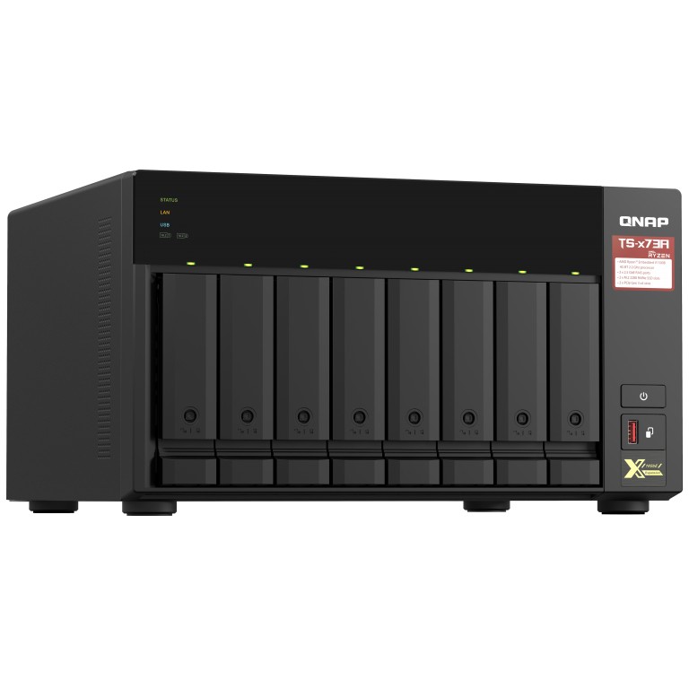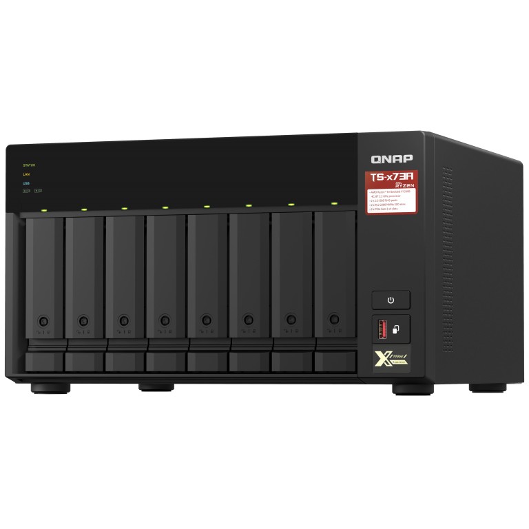 Ausgestattet mit einem AMD Ryzen™ V1000 Serie V1500B Quad-Core Prozessor, der mit bis zu Quad-Core / 8 Threads und Turbo Core bis zu 2,2 GHz eine großartige Systemleistung liefert. Das TS-873A verfügt über zwei 2,5GbE RJ45 Ports und zwei PCIe Gen 3 Steckplätze, damit Sie flexibel 5GbE/10GbE Netzwerke einsetzen können. Zwei M.2 NVMe SSD Steckplätze für Qtier Technologie und SSD-Caching ermöglichen eine ständige Speicheroptimierung. Das TS-873A unterstützt QTS und QuTS hero, so dass der Anwender je nach Bedarf flexibel das Betriebssystem wechseln kann.