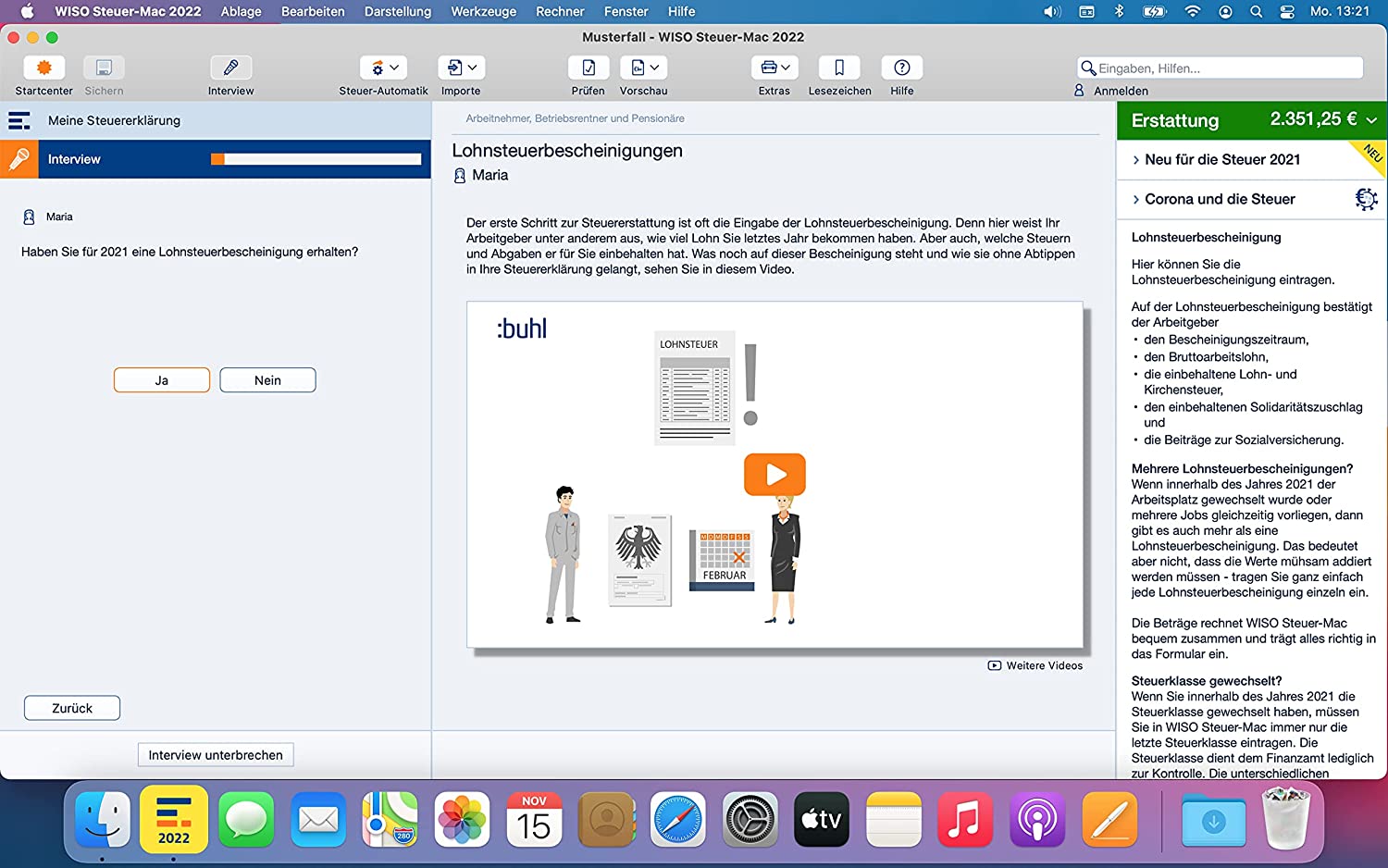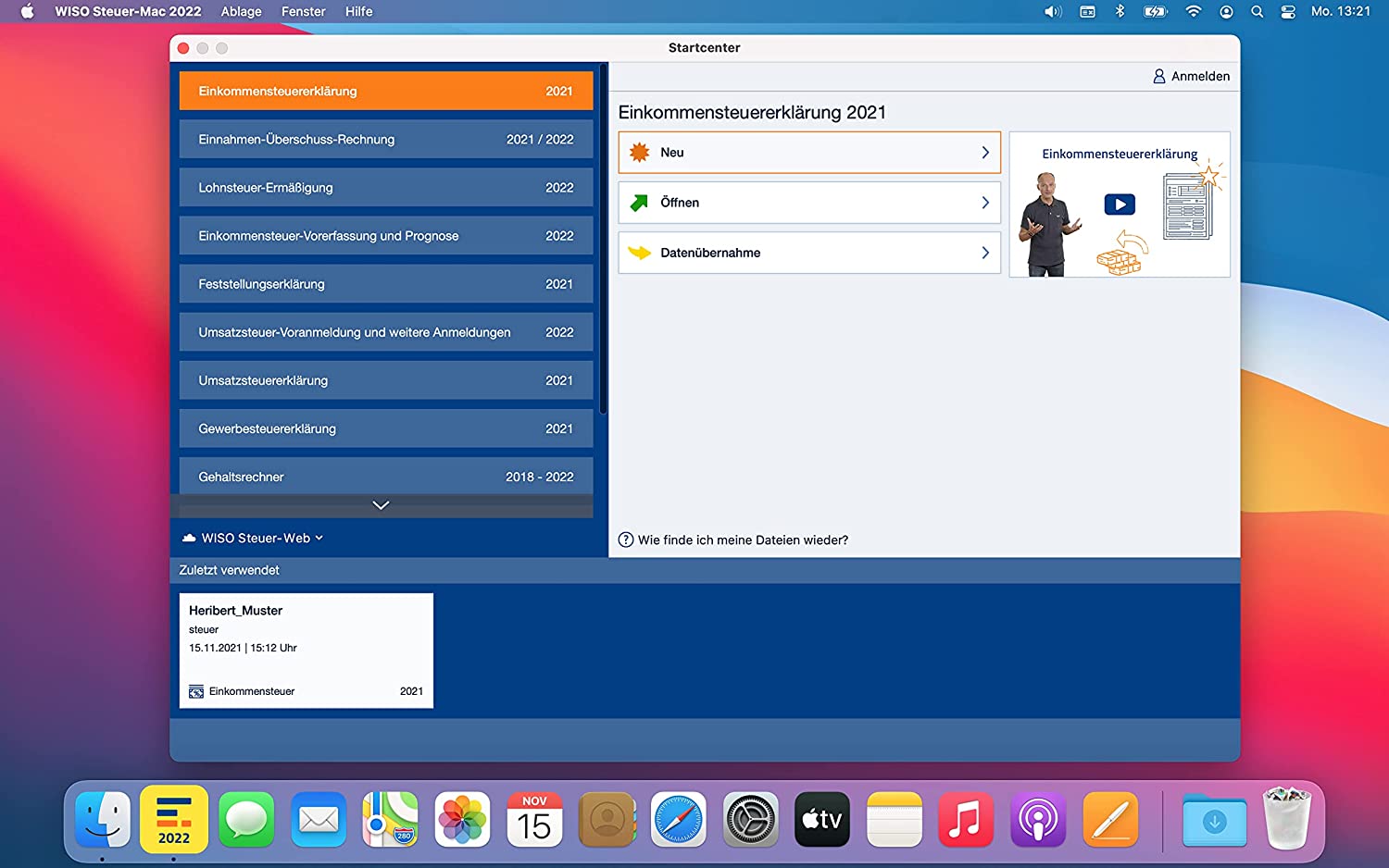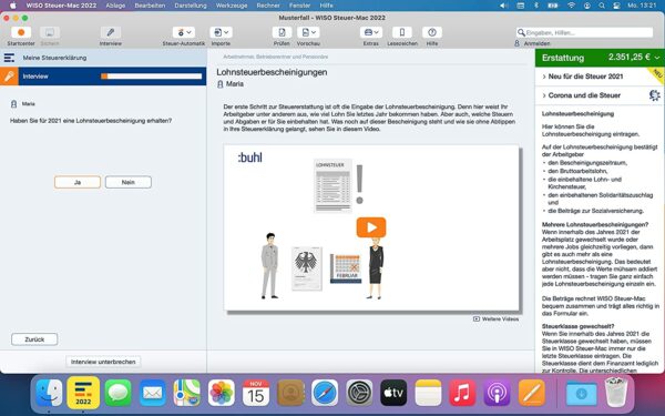 im beruflichen und privaten kontext ist die thematik der steuererklärung nicht sonderlich beliebt. es gibt umfangreiche änderungen, viele anlagen und daten, die leicht zu einem gefühl der überforderung führen können. die software wiso steuer-mac 2022 hat sich genau diesem problem der überforderung angenommen und zeichnet sich durch eine äußerst benutzerfreundliche oberfläche sowie eine effiziente durchführung der einzelnen anlagen aus.