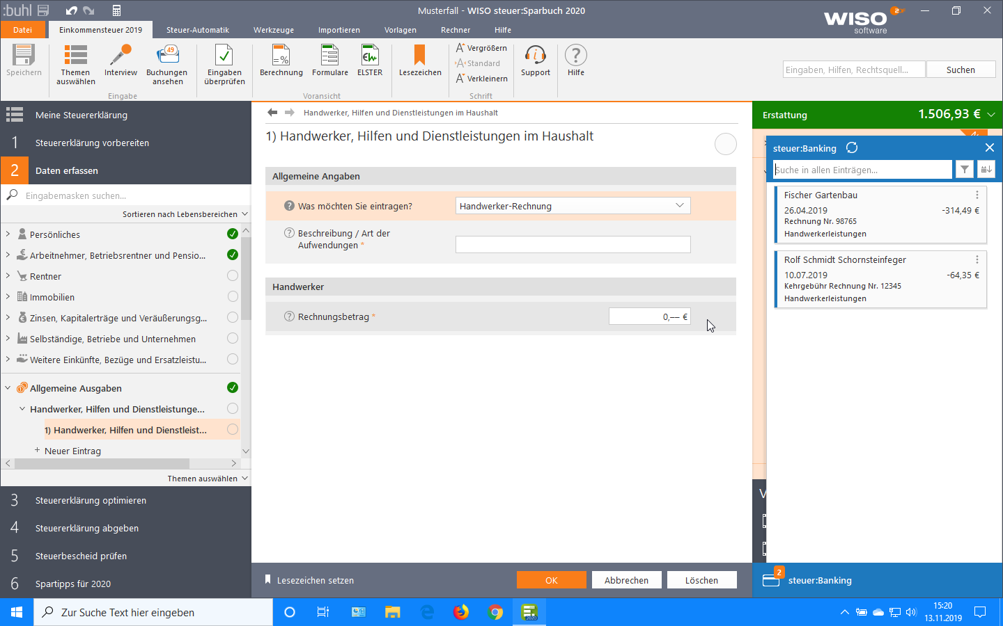 das wiso steuer sparen buch 2020 von bestsoftware bietet ihnen alle erforderlichen tools, um von dieser rückzahlung zu profitieren. im mittelpunkt steht die geführte erstellung einer steuererklärung, mit der sie ihren anspruch auf rückerstattung bei ihrem finanzamt geltend machen können. übrigens benötigen sie keine besonderen kenntnisse oder fähigkeiten, um die erklärung korrekt auszufüllen, da ihnen dieses beliebte programm in jeder hinsicht unterstützung bietet.