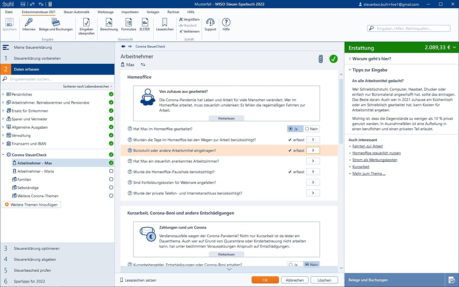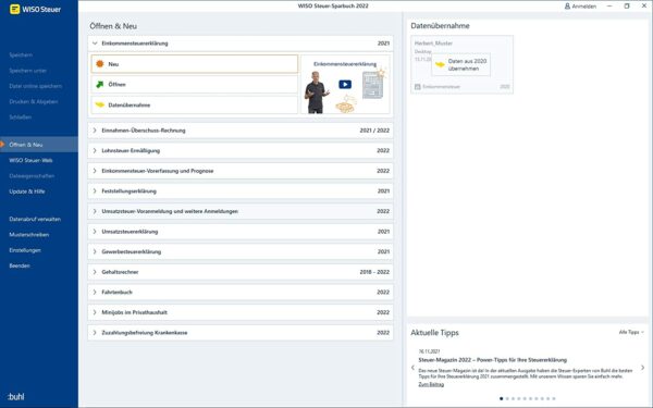 das wiso steuer sparbuch 2022 eröffnet ihnen die möglichkeit, von nützlichen steuertipps zu profitieren und unter optimalen bedingungen eine umfangreiche steuererstattung zu erhalten. allerdings bietet die software weit mehr als lediglich die suche nach einsparmöglichkeiten und tipps. mit dem kauf des programms können sie bis zu fünf steuererklärungen erstellen und einreichen, wodurch sie eine hohe flexibilität genießen. die version beinhaltet selbstverständlich den mantelbogen sowie sämtliche relevanten anlagen für das steuerjahr 2021, um ihnen beste voraussetzungen für die erstellung der steuererklärung zu bieten. auch im bereich der einkünfte erweist sich die software als äußerst vielfältig. ganz gleich, ob sie arbeitnehmer, vermieter oder klassischer gewerbetreibender sind, haben sie die möglichkeit, problemlos verschiedene einkommensarten anzugeben.